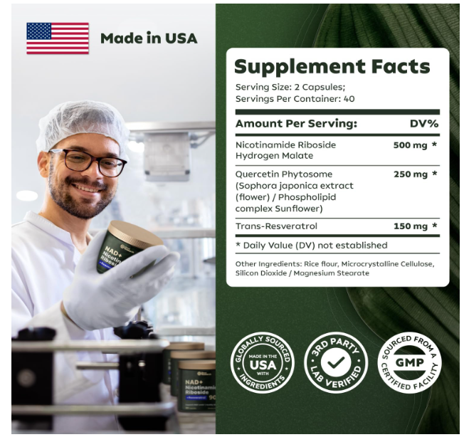 🛡️ Calidad garantizada en los Estados Unidos: Nuestro suplemento, que combina ribósido de nicotinamida, resveratrol y quercetina, es sometido a rigurosas pruebas de terceros en los Estados Unidos para garantizar su pureza y efectividad. ✅ Certificados de calidad disponibles bajo solicitud. 🌟 Recupera lo mejor de ti con el refuerzo avanzado de NAD+.